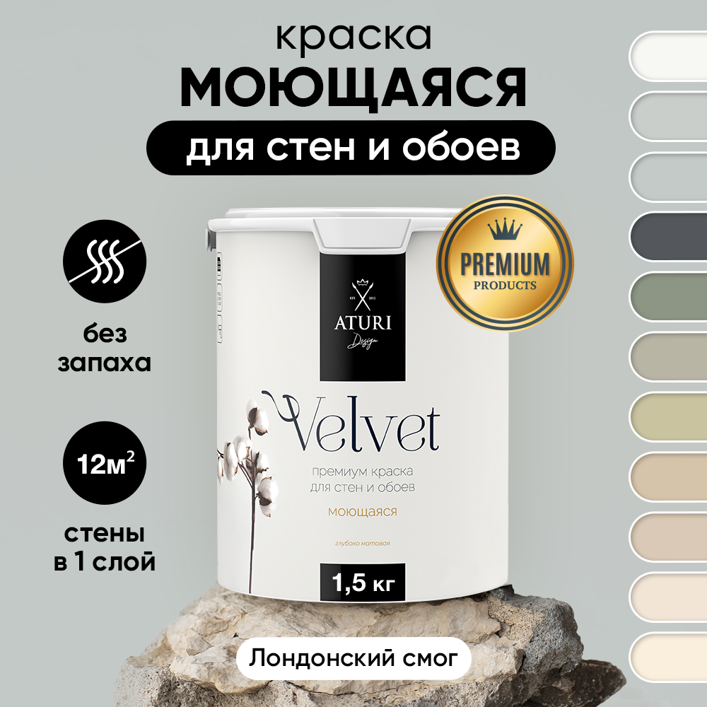 СохранитьКраска Aturi Design Mia интерьерная, для стен, моющаяся; Цвет: Лондонский смог, 1,5 кг интересное: