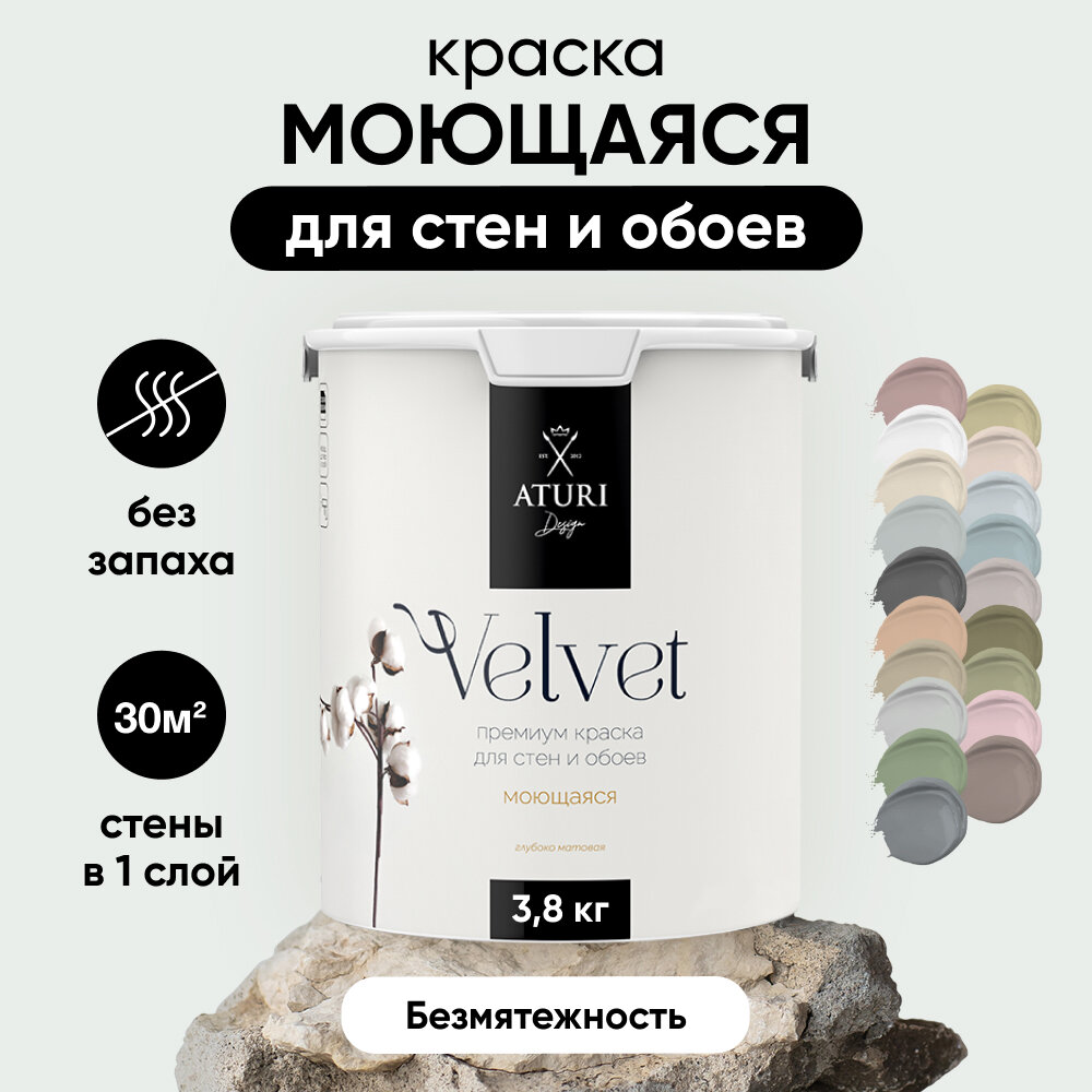 Краска интерьерная для стен и обоев 3,5 кг Aturi Design Velvet, Безмятежность, моющаяся, матовая, серая, без запаха