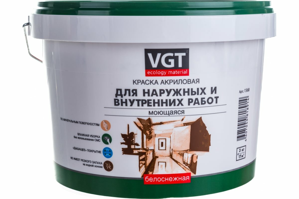 Купить VGT ВД-АК-1180 белоснежная краска моющаяся для наружных и внутренних работ, матовая (3кг)