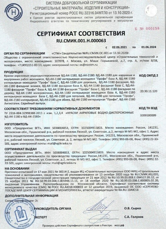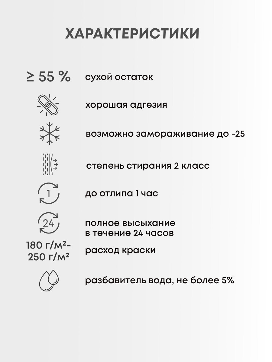 | Дополнительная информация | рекомендуется нанесение двух слоёв краски с промежуточной сушкой 1 час. Полный набор прочности и устойчивость к влажной уборке достигается через 2 недели. Степень истирания: 2 класс |