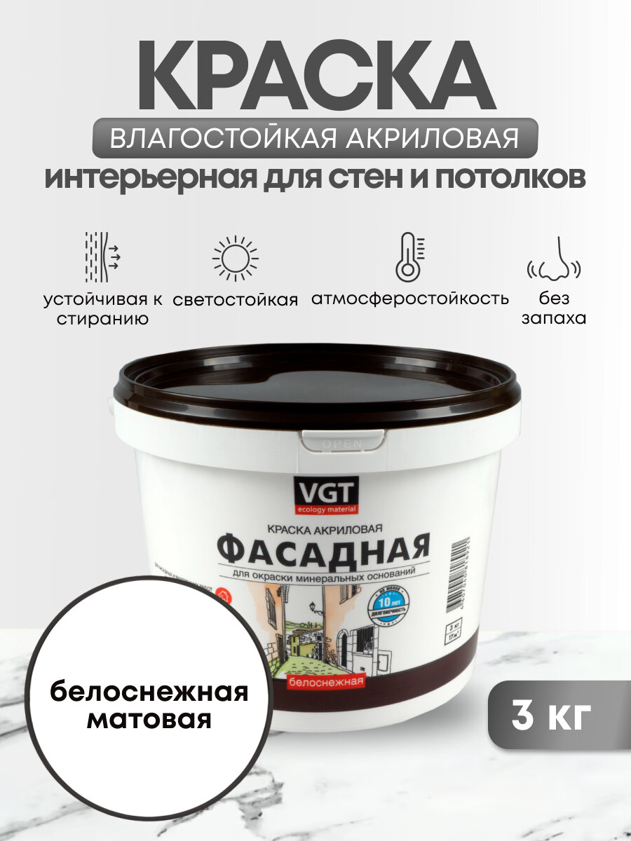 Краска акриловая VGT ВД-АК-1180 фасадная "Белоснежная" влагостойкая моющаяся матовая белый 3 кг