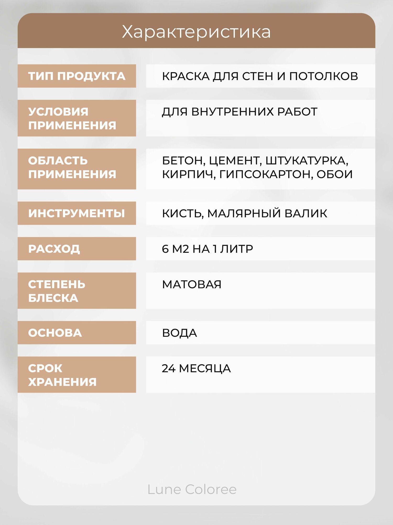 Интерьерная краска для стен и потолков Lune Coloree моющаяся, матовая, бежевый 3кг