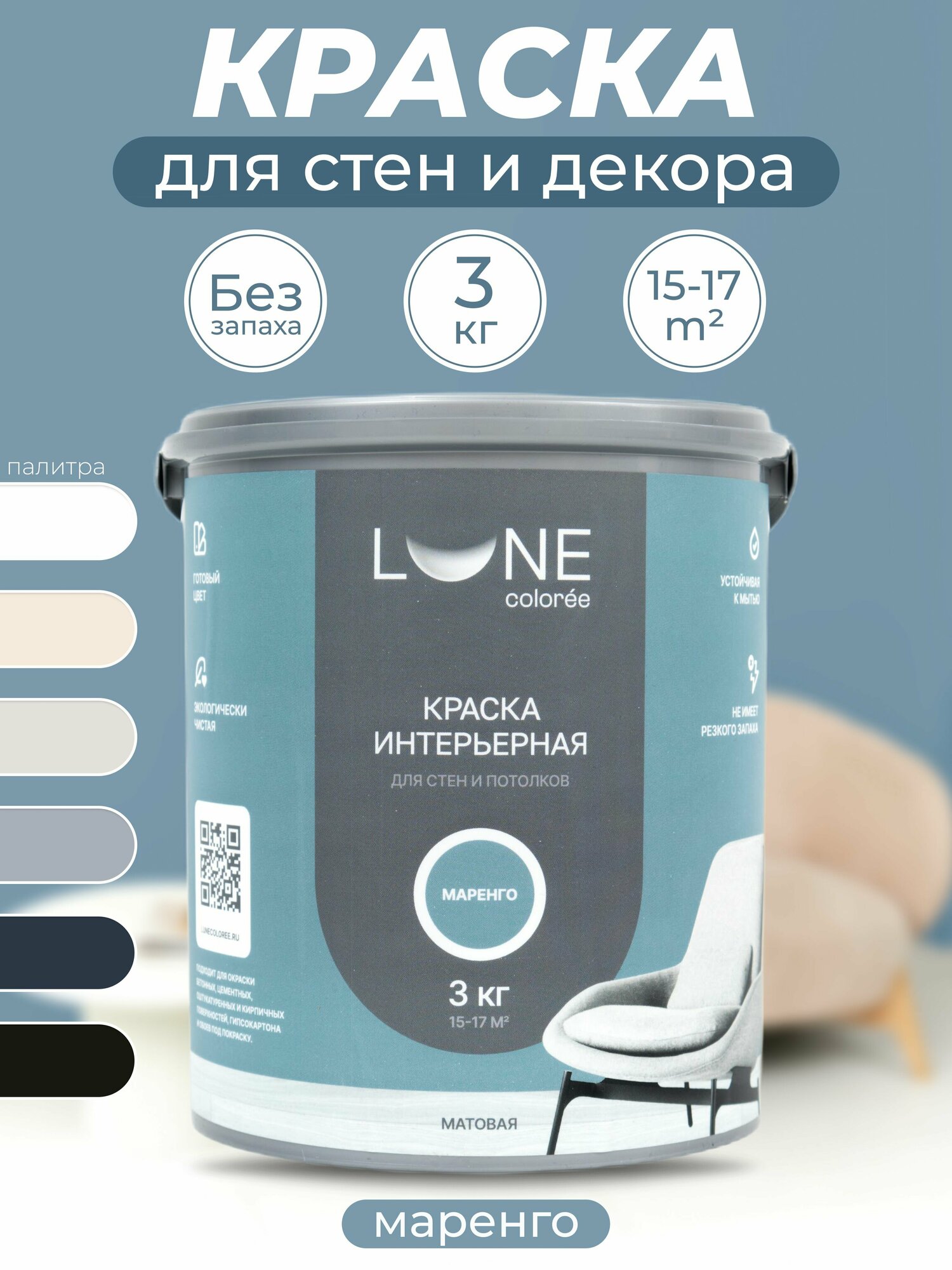 Интерьерная краска для стен и потолков Lune Coloree моющаяся, матовая, графитовый 3кг