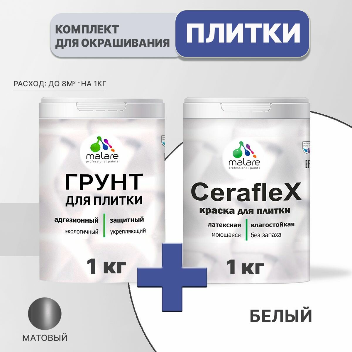 Купить Комплект Malare для окрашивания плитки и кафеля (1кг грунт + 1кг краска), акриловый, без запаха, быстросохнущий, матовый, цвет белый