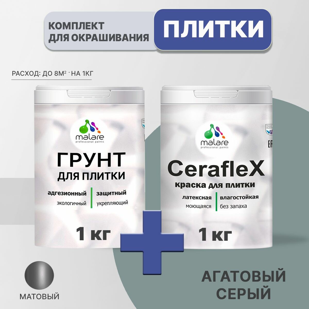 Купить Комплект Malare для окрашивания плитки и кафеля (1кг грунт + 1кг краска), акриловый, без запаха, быстросохнущий, матовый, цвет агатовый серый