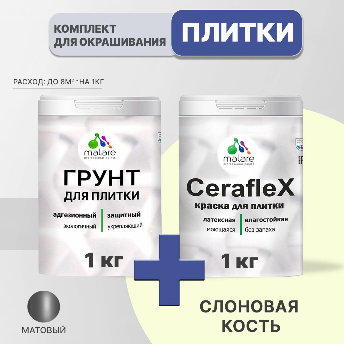 Купить Комплект Malare для окрашивания плитки и кафеля (1кг грунт + 1кг краска), акриловый, без запаха, быстросохнущий, матовый, цвет слоновая кость