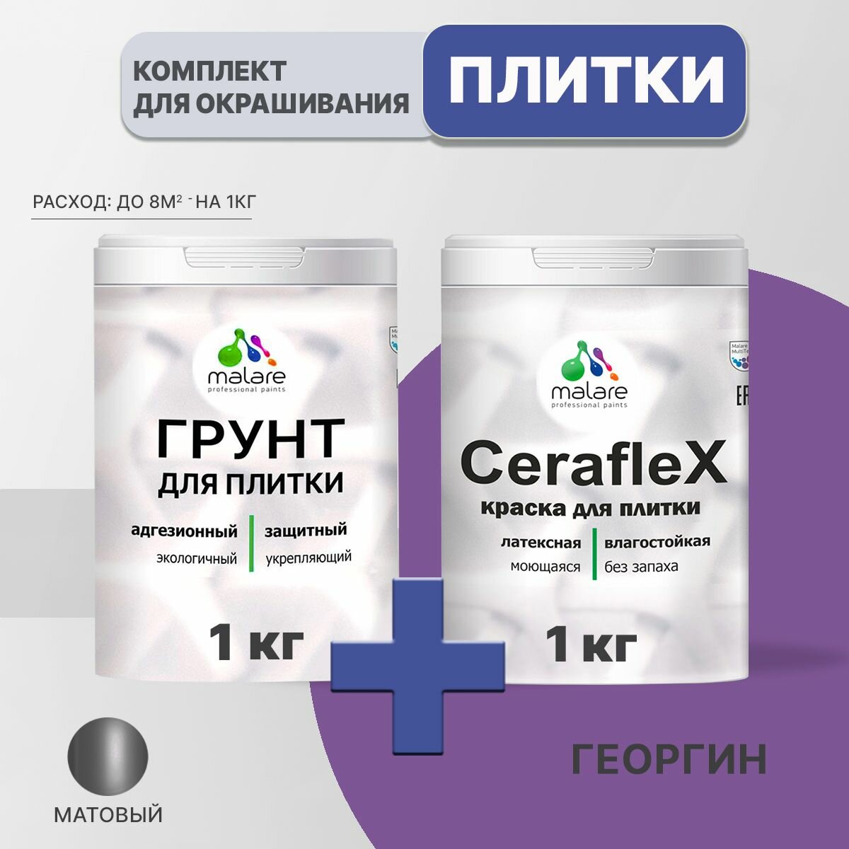 Комплект Malare для окрашивания плитки и кафеля (1кг грунт + 1кг краска), акриловый, без запаха, быстросохнущий, матовый, цвет фиалковый