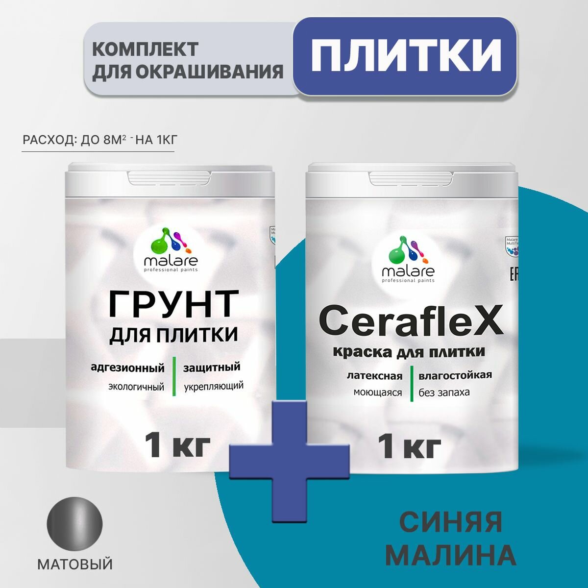 Купить Комплект Malare для окрашивания плитки и кафеля (1кг грунт + 1кг краска), акриловый, без запаха, быстросохнущий, матовый, цвет синяя малина