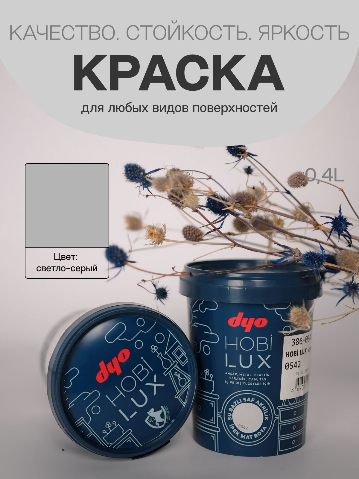 Краска "Dyo" шелковисто-матовая, для любых поверхностей "HOBILUX" цвет серый 0,4л