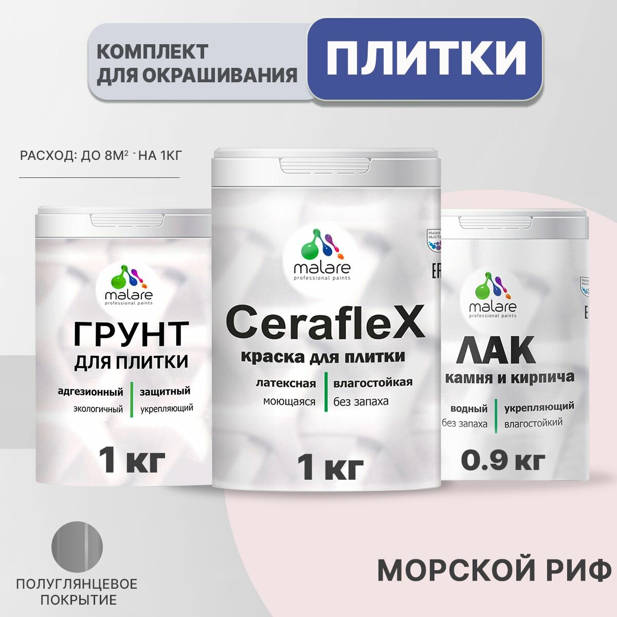 Купить Комплект Malare для окрашивания плитки и кафеля (1кг грунт + 1кг краска + 0,9кг лак), без запаха, полуглянцевый, цвет морской риф