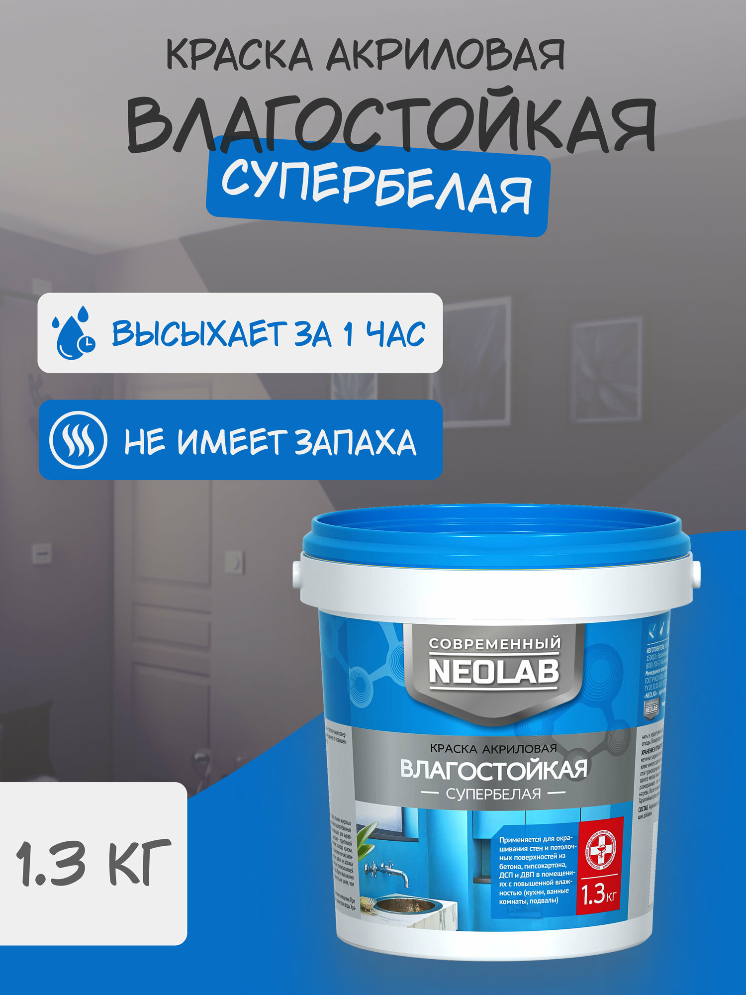 NEOLAB , Краска акриловая супербелая влагостойкая , 1,3 кг