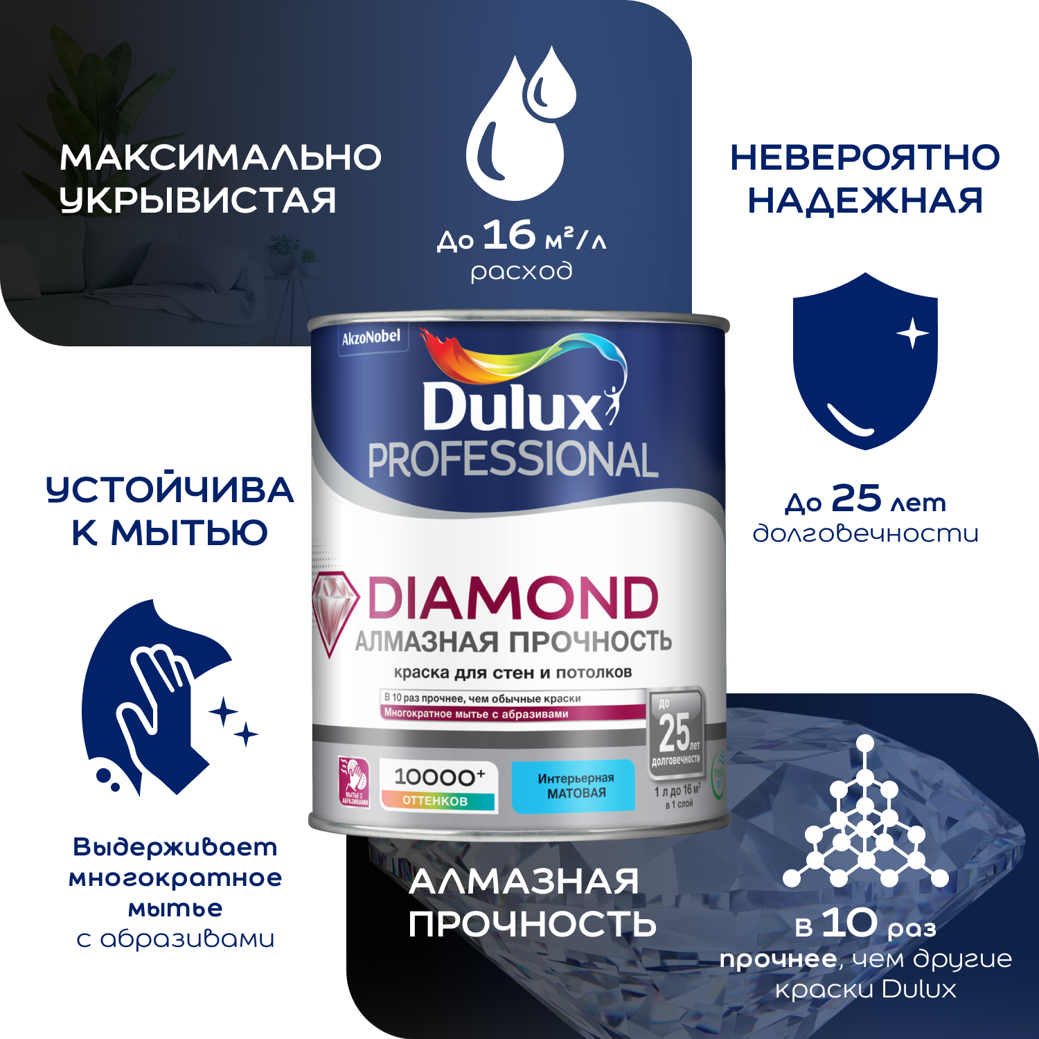 Купить Краска Dulux Diamond алмазная прочность влагостойкая моющаяся матовая белый база BW 9л