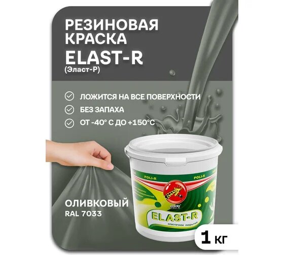 Резиновая Краска Эластичная Polir-R Elast-R 6кг Оливковый RAL 7033 для Ванных Комнат, Влажных Помещений, Потолков, Стен, Заборов, Фасадов, Крыш.