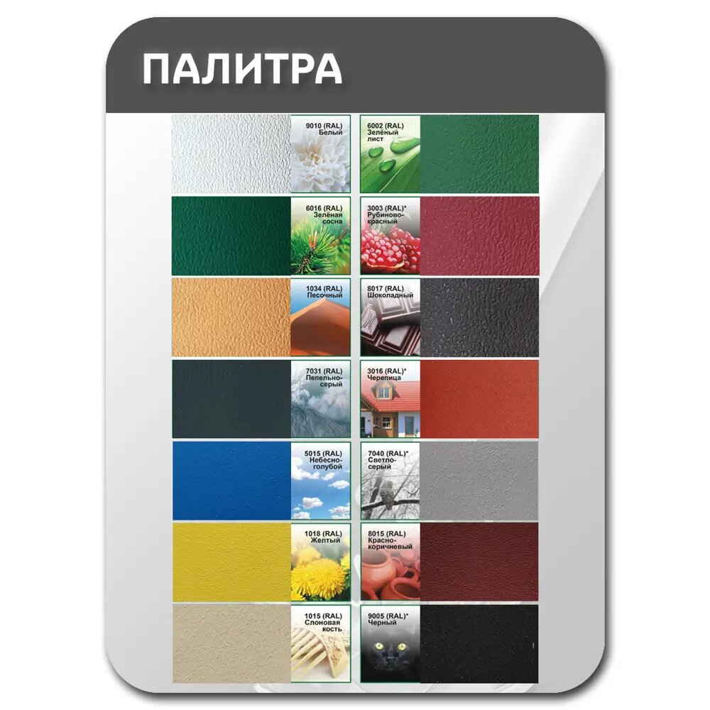 | Цвет товара | RAL 7024 графит, RAL 7024 графитово-серый, Шоколадный, белый, бесцветный, желтый RAL 1018, зеленая сосна, зеленый лист, зеленый лист RAL 6002, индиго, красно-коричневый, небесно-голубой, небесно-голубой RAL 5015, оливковый, пепельно-серый, песочный, рубиновый красный, рубиновый красный RAL 3003, светло-серый, слоновая кость, черепичный, черный |