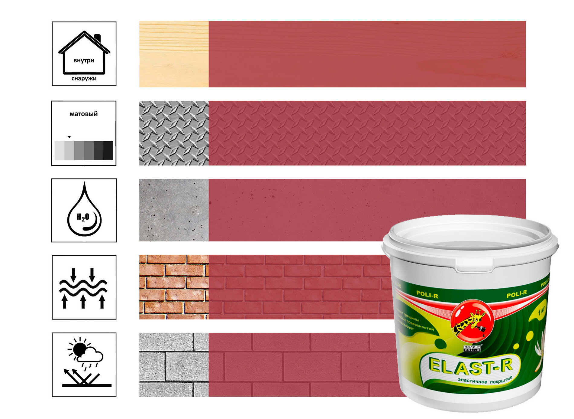 Резиновая Краска Эластичная Polir-R Elast-R 6кг Рубиновый Красный RAL 3003 для Ванных Комнат, Влажных Помещений, Потолков, Стен, Заборов, Фасадов, Крыш.