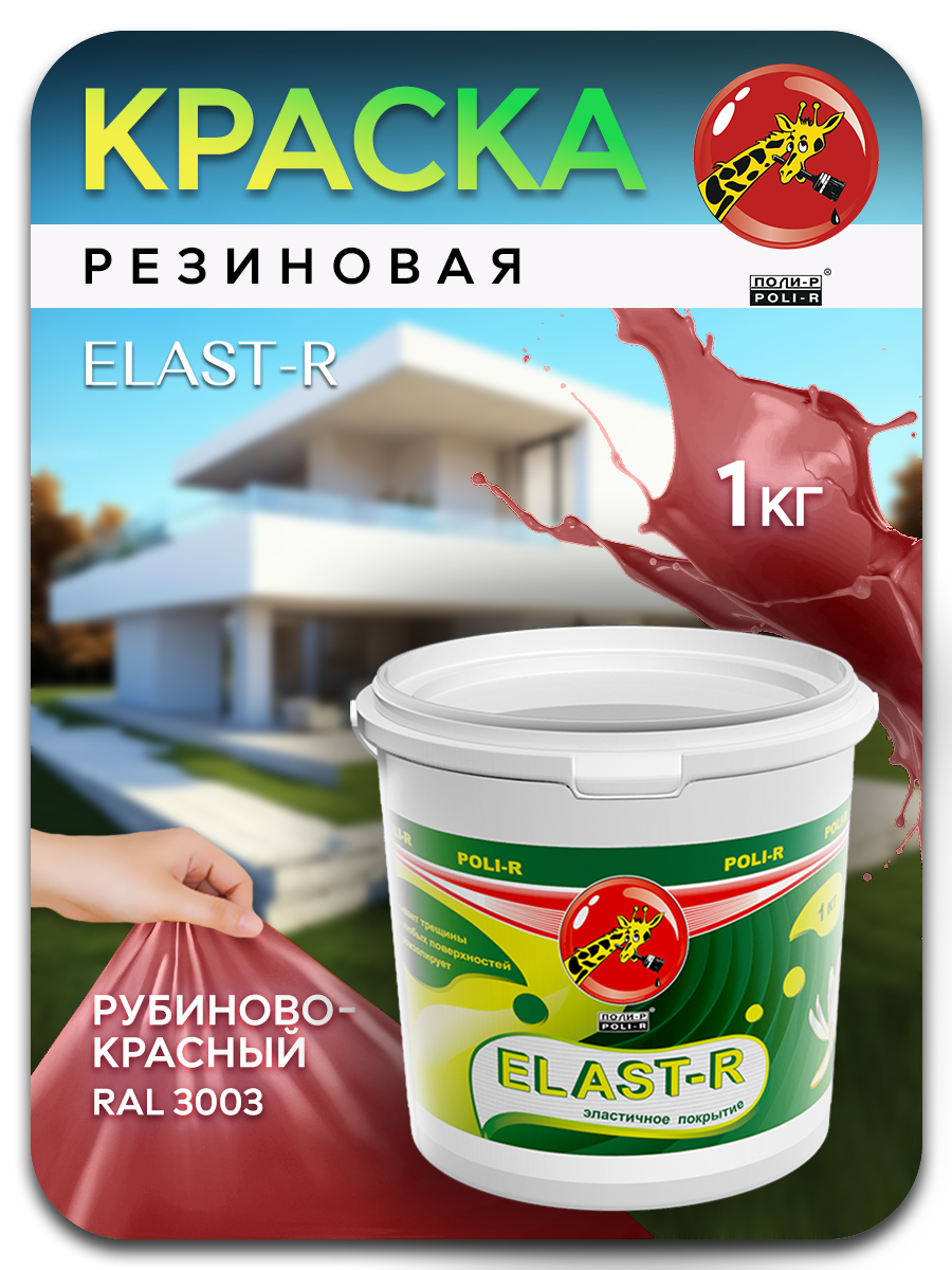 Резиновая Краска Эластичная Polir-R Elast-R 3кг Рубиновый Красный RAL 3003 для Ванных Комнат, Влажных Помещений, Потолков, Стен, Заборов, Фасадов, Крыш.