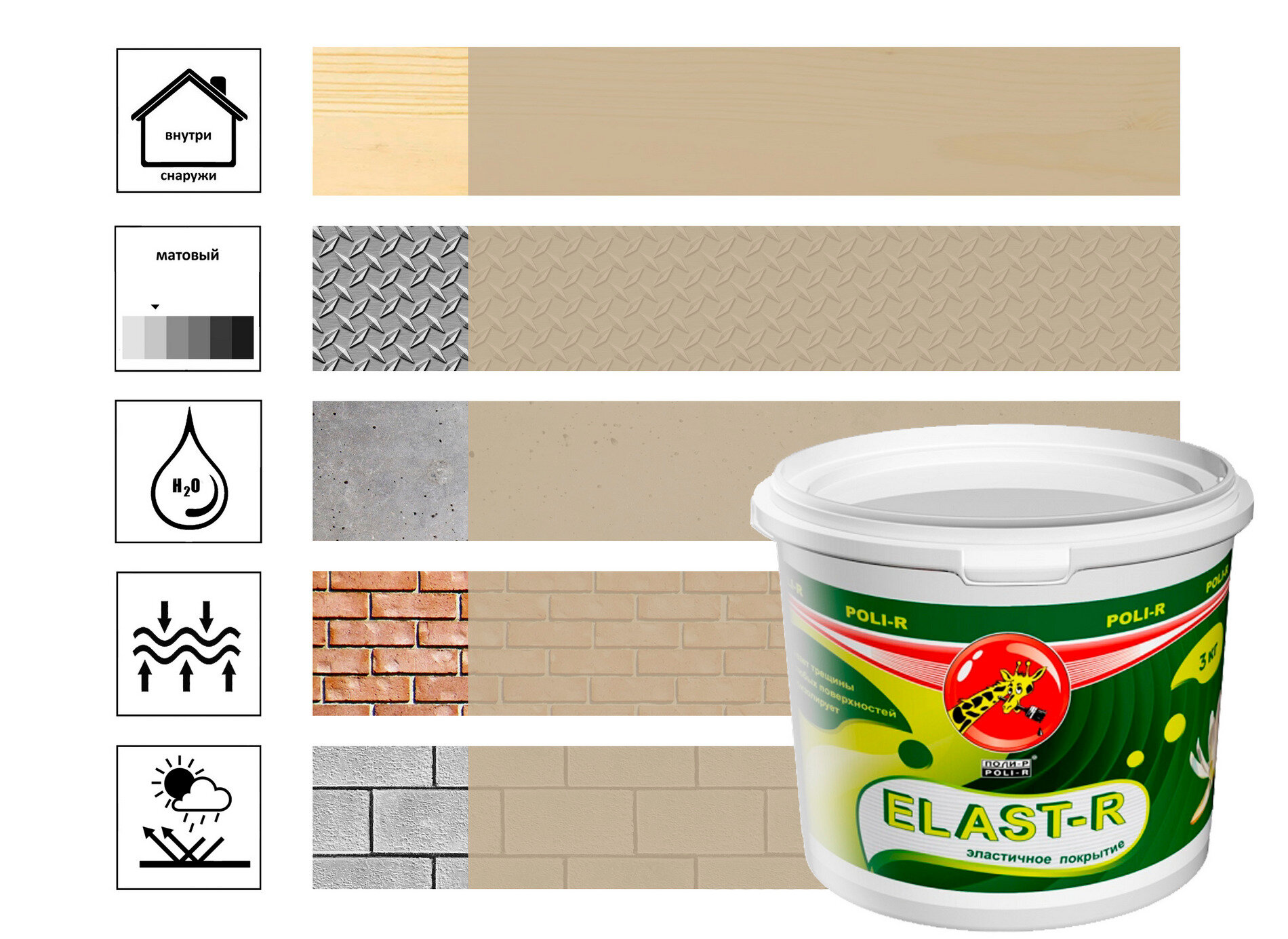 Ниже Вы можете прочитать отзывы на Эластичная краска для всех поверхностей Poli-Elast R, ознакомится с подробными характеристиками, посмотреть интересные обзоры и фотографии на Эластичная краска для всех поверхностей Poli-Elast R.