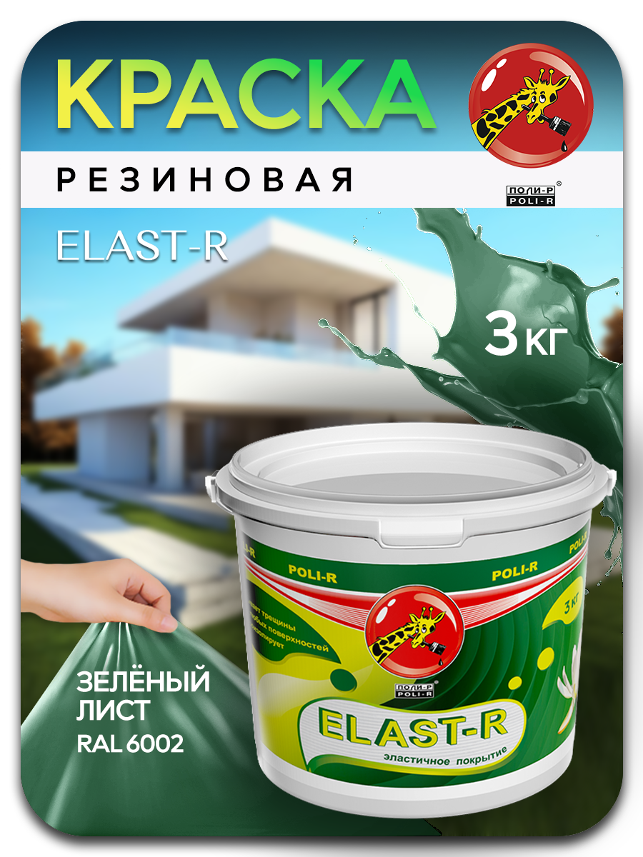 Резиновая Краска Эластичная Polir-R Elast-R 6кг Оливковый RAL 7033 для Ванных Комнат, Влажных Помещений, Потолков, Стен, Заборов, Фасадов, Крыш.