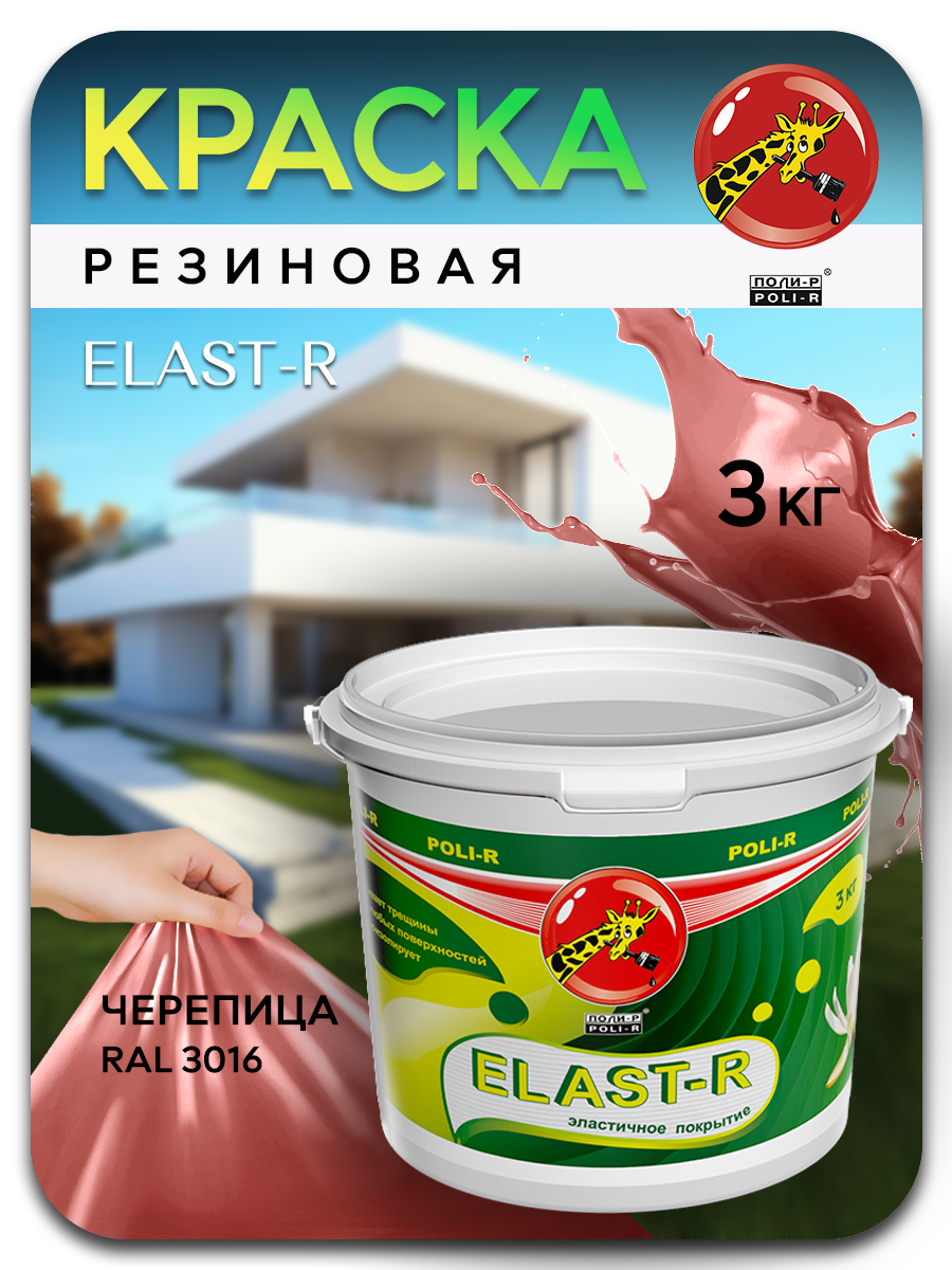 Резиновая Краска Эластичная Polir-R Elast-R 3кг Рубиновый Красный RAL 3003 для Ванных Комнат, Влажных Помещений, Потолков, Стен, Заборов, Фасадов, Крыш.