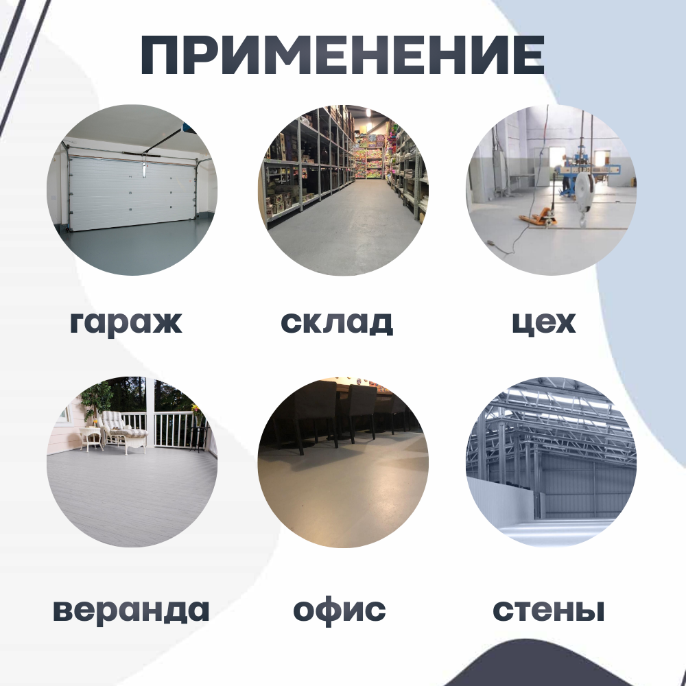 | Область применения | для аэродромов / для водостоков / для гаражей / для дверей / для дорожной разметки / для кровли / для лестницы / для пола / для потолков / для стен / для фасадов / для цоколя |