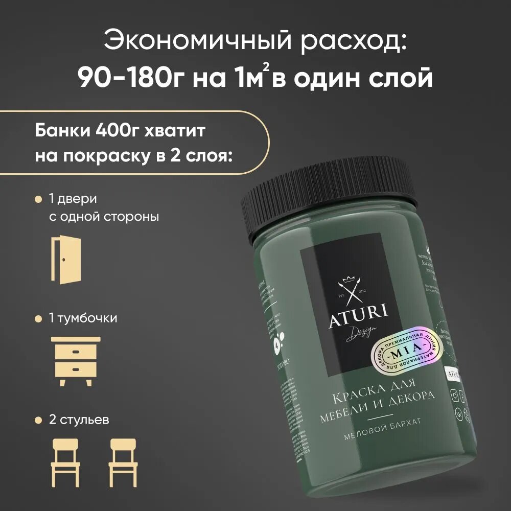 Краска Aturi Design Mia для мебели и декора, кухни и кухонных фасадов, дверей, пластика и металла; Набор, 400гр х 2 шт; Цвет: Оливия, оливковый, зеленый