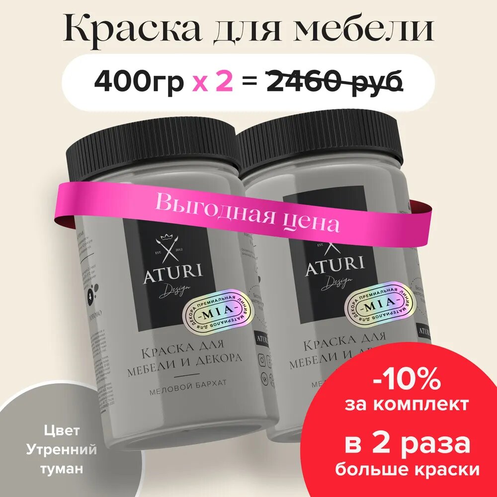 СохранитьНабор 2 шт по 0,4 кг. Матовая краска для мебели без запаха, меловая быстросохнущая Aturi Design для декора, кухни и кухонных фасадов, дверей, пластика и металла. Цвет: Утренний туман, серо бежевый интересное: