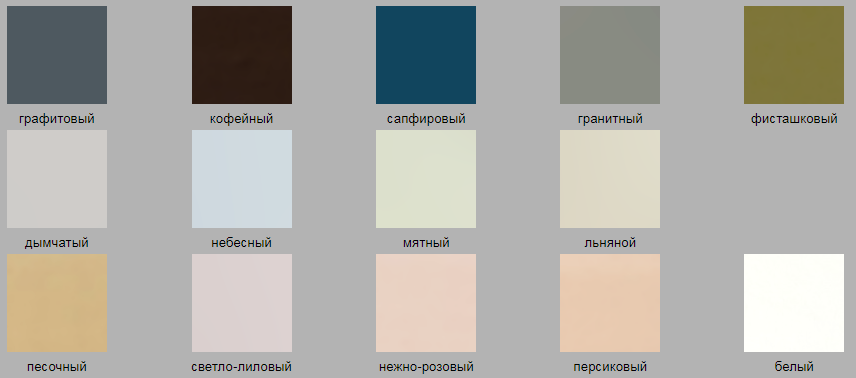 | Цвет товара | Гранитный, белый, графитовый, дымчатый, льняной, мятный, небесный, прозрачный, сапфировый, светло-лиловый |