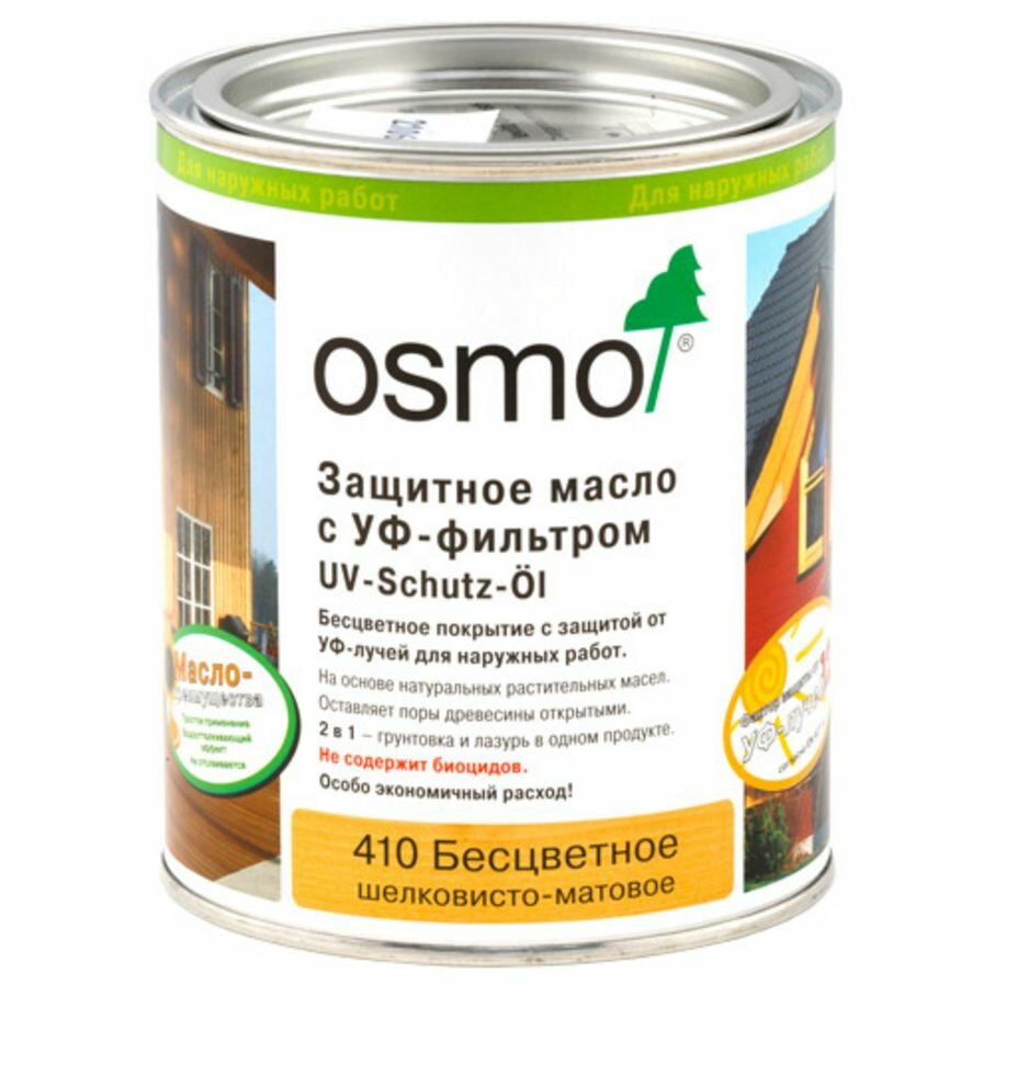Osmo Защитное масло с УФ-фильтром UV-Schutz-Öl 410 Бесцветное шелковисто-матовое, без биоцидов. 0.125л