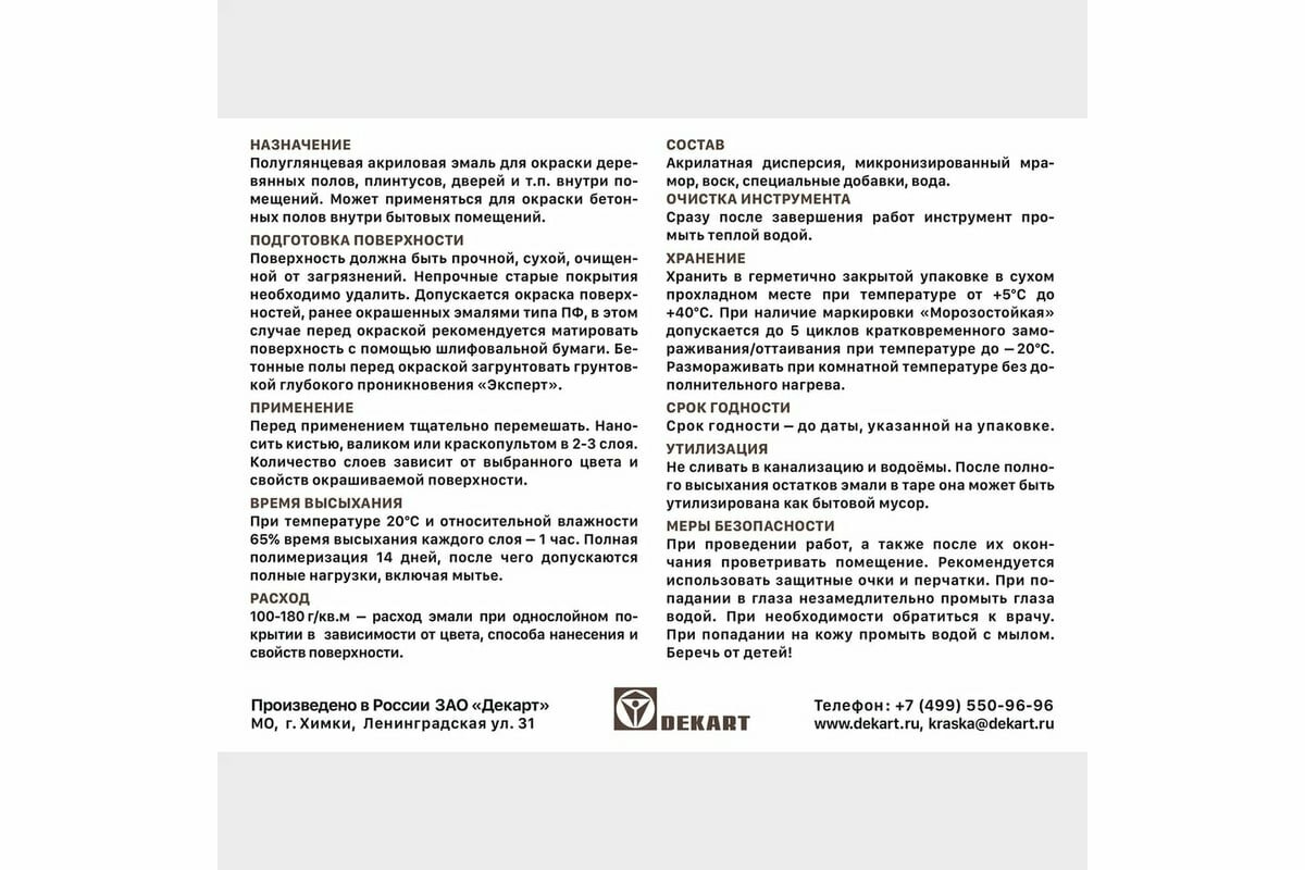 | Дополнительная информация | при температуре 20°С и относительной влажности 65% время высыхания каждого слоя – 2 часа; полная полимеризация – 14 дней, после чего допускаются полные нагрузки, включая мытье |
