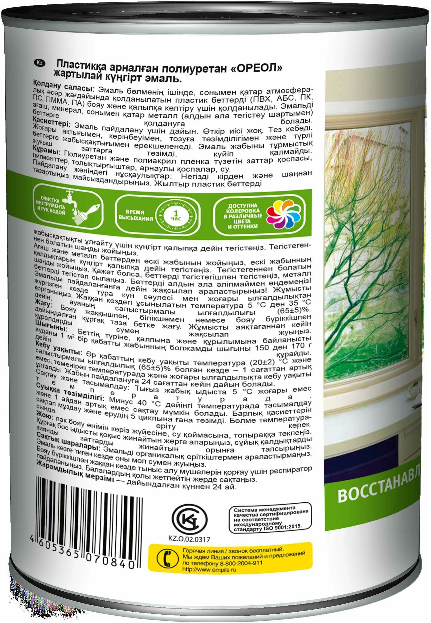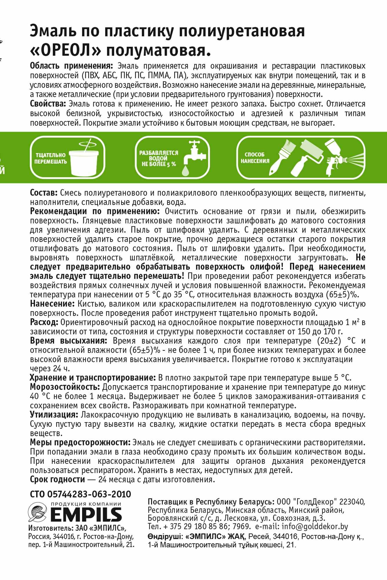 | Дополнительная информация | Эмаль по пластику полиуретановая акриловая. Применяется для окрашивания и реставрации пластиковых поверхностей (ПВХ, АБС, ПК, ПС, ПММА, ПА), эксплуатируемых как внутри помещений, так и в условиях атмосферного воздействия. Возможно нанесение эмали на деревянные, минеральные, а также металлические (при условии предварительного грунтования) поверхности. |
