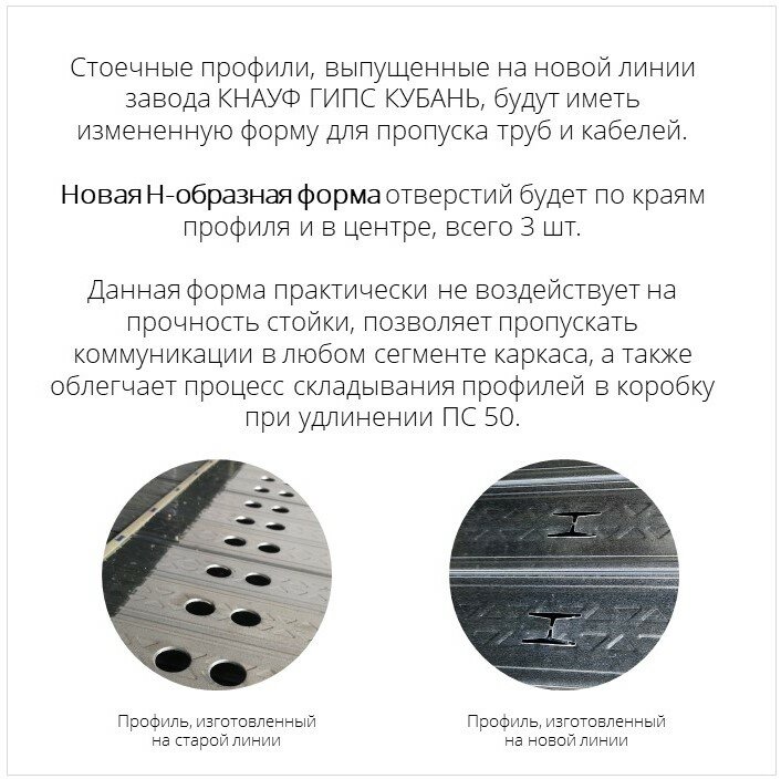| Дополнительная информация | специальные треугольные ребра жесткости придают профилю дополнительное усиление: перегородки, в которых используются эти профили, могут выдерживать тяжелые шкафы и полки; две пары отверстий диаметром 33 мм |