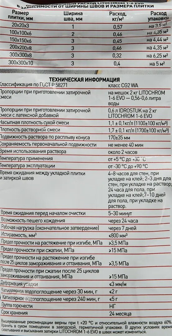 | Дополнительная информация | средний расход при использовании в качестве клея - 1,45 кг/м² на каждый 1 мм толщины слоя; устойчивость затёртых швов к резким перепадам температур, от -20 °С до +100 °С; время открытого слоя: 20 минут; время корректировки: 60 минут |