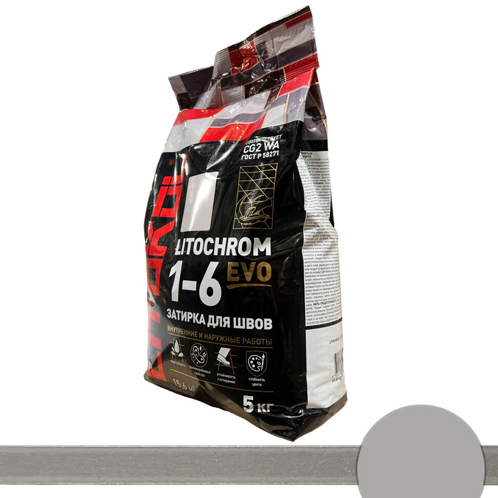 Затирочная Смесь Litokol Litochrom 1-6 Evo 5кг LE.120 Жемчужно-Серый, Цементная для Затирки Швов Плитки от 1 до 6 мм / Литокол Литохром Эво.