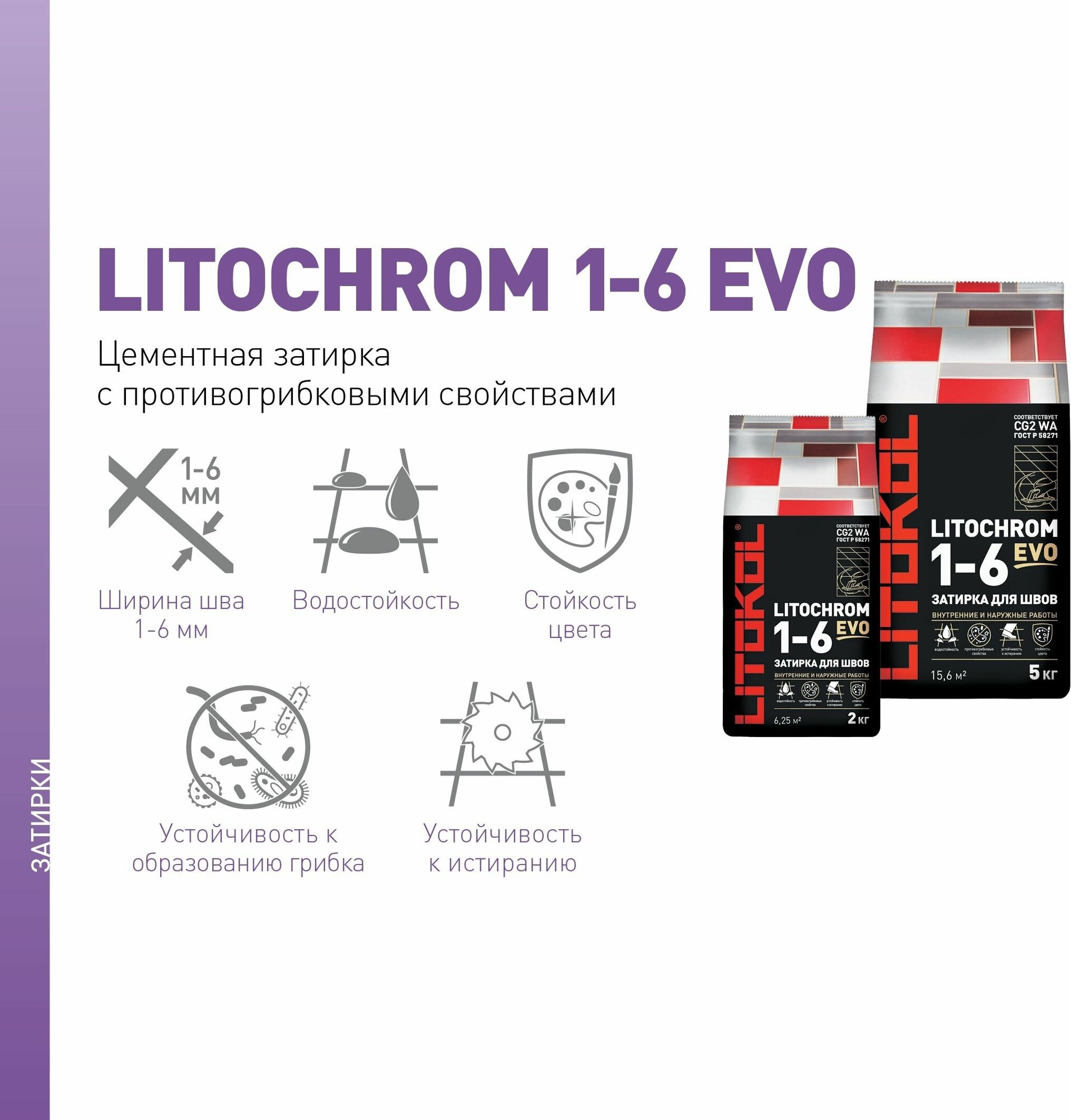 Затирочная Смесь Litokol Litochrom 1-6 Evo 5кг LE.125 Дымчатый Серый, Цементная для Затирки Швов Плитки от 1 до 6 мм / Литокол Литохром Эво.