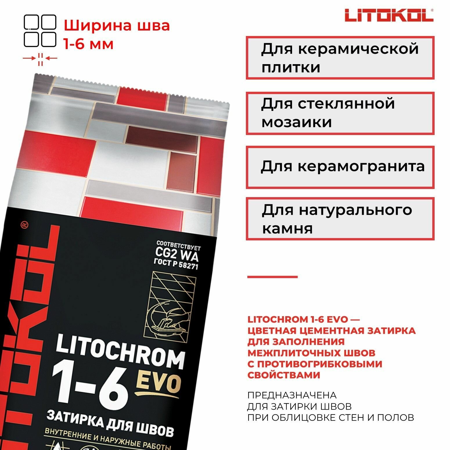 Затирочная Смесь Litokol Litochrom 1-6 Evo 5кг LE.125 Дымчатый Серый, Цементная для Затирки Швов Плитки от 1 до 6 мм / Литокол Литохром Эво.