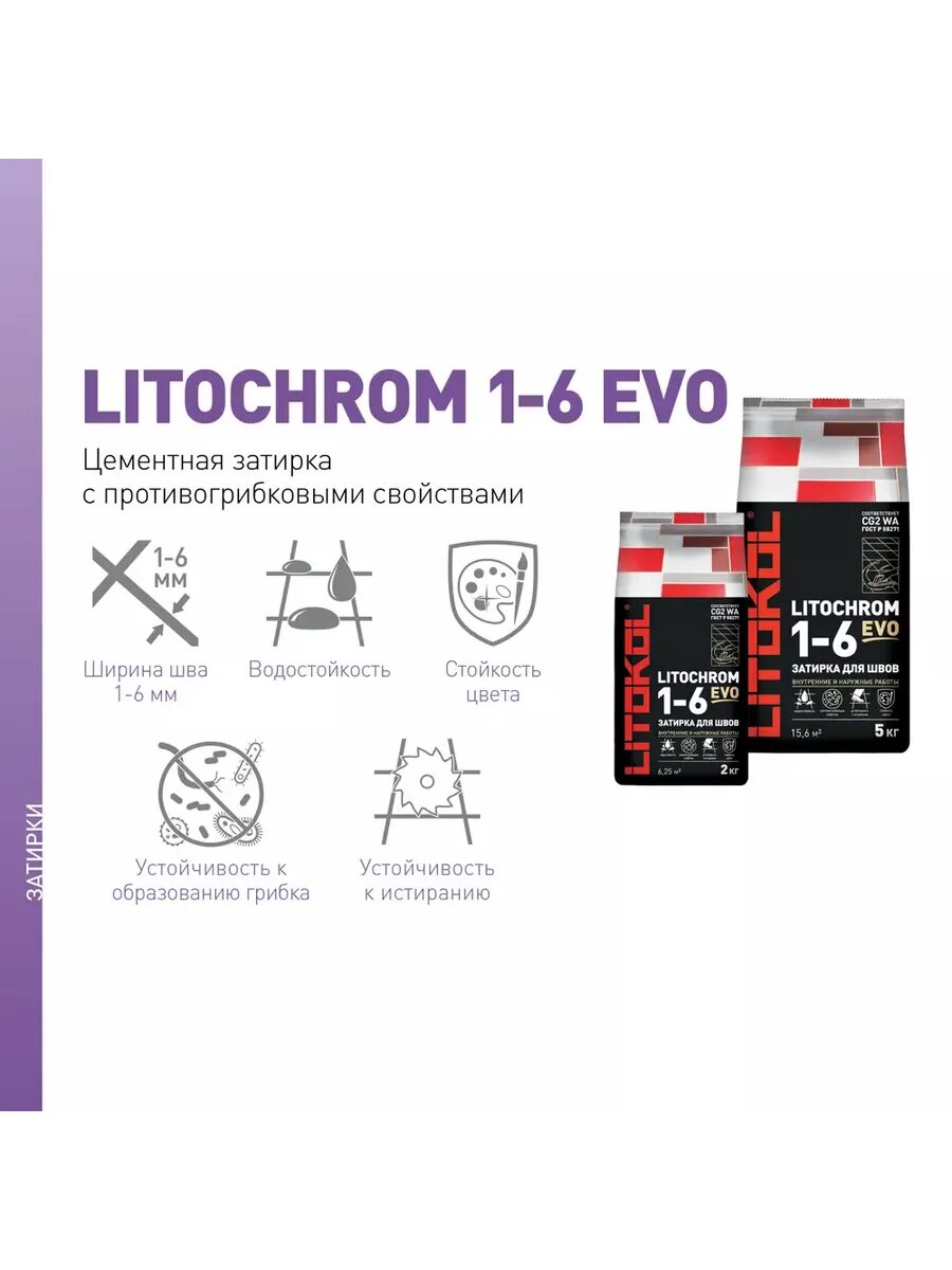 Затирочная Смесь Litokol Litochrom 1-6 Evo 5кг LE.120 Жемчужно-Серый, Цементная для Затирки Швов Плитки от 1 до 6 мм / Литокол Литохром Эво.