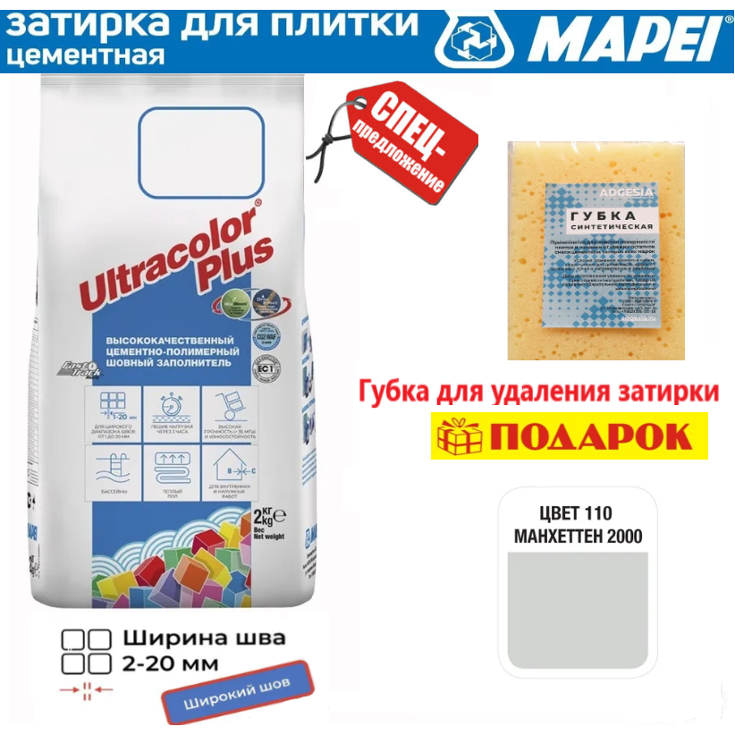 Купить Цементная затирка MAPEI Ultracolor Plus №110 Манхеттен(2 кг)+ губка в подарок!