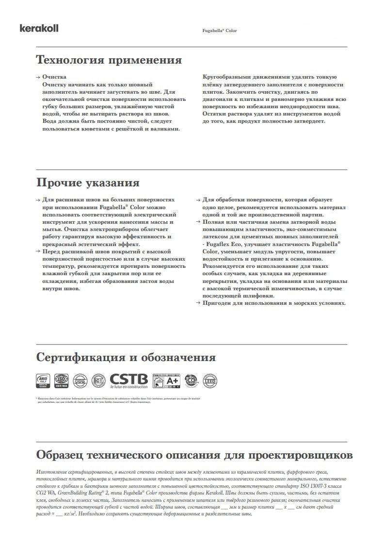 | Область применения | для ванной комнаты, для внутренних работ, для герметизации угловых швов и стыков, для затирки швов, для кухни, для наружных работ, для пола, для производственных помещений, для стен, для теплого пола, искусственный камень, керамическая плитка, керамогранит, клинкерная плитка, мозаика, натуральный камень, прозрачная и полупрозрачная плитка, террасы и балконы |