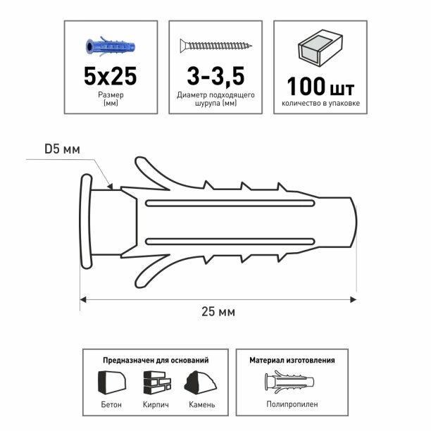 | Дополнительная информация | Дюбель для крепления изделий в полнотелых основаниях. |