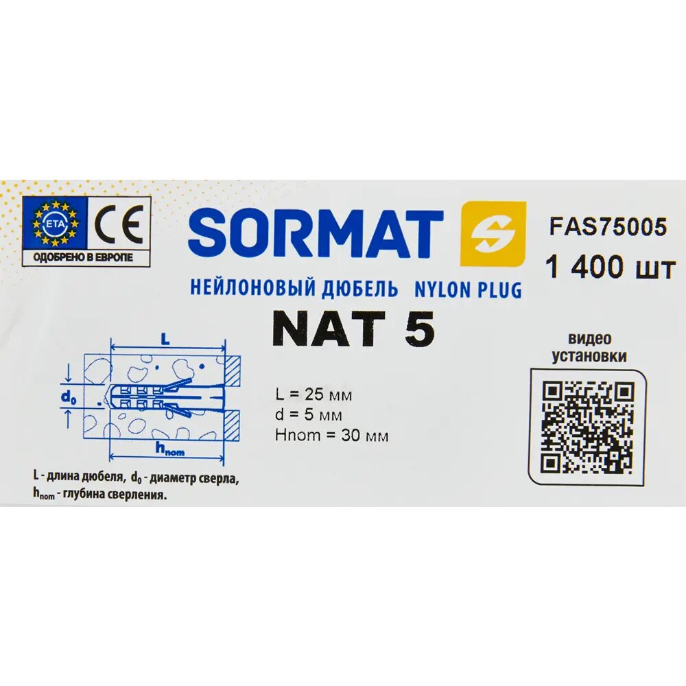 | Дополнительная информация | Дюбель Sormat NAT нейлон 5x25 мм 1400 шт. |