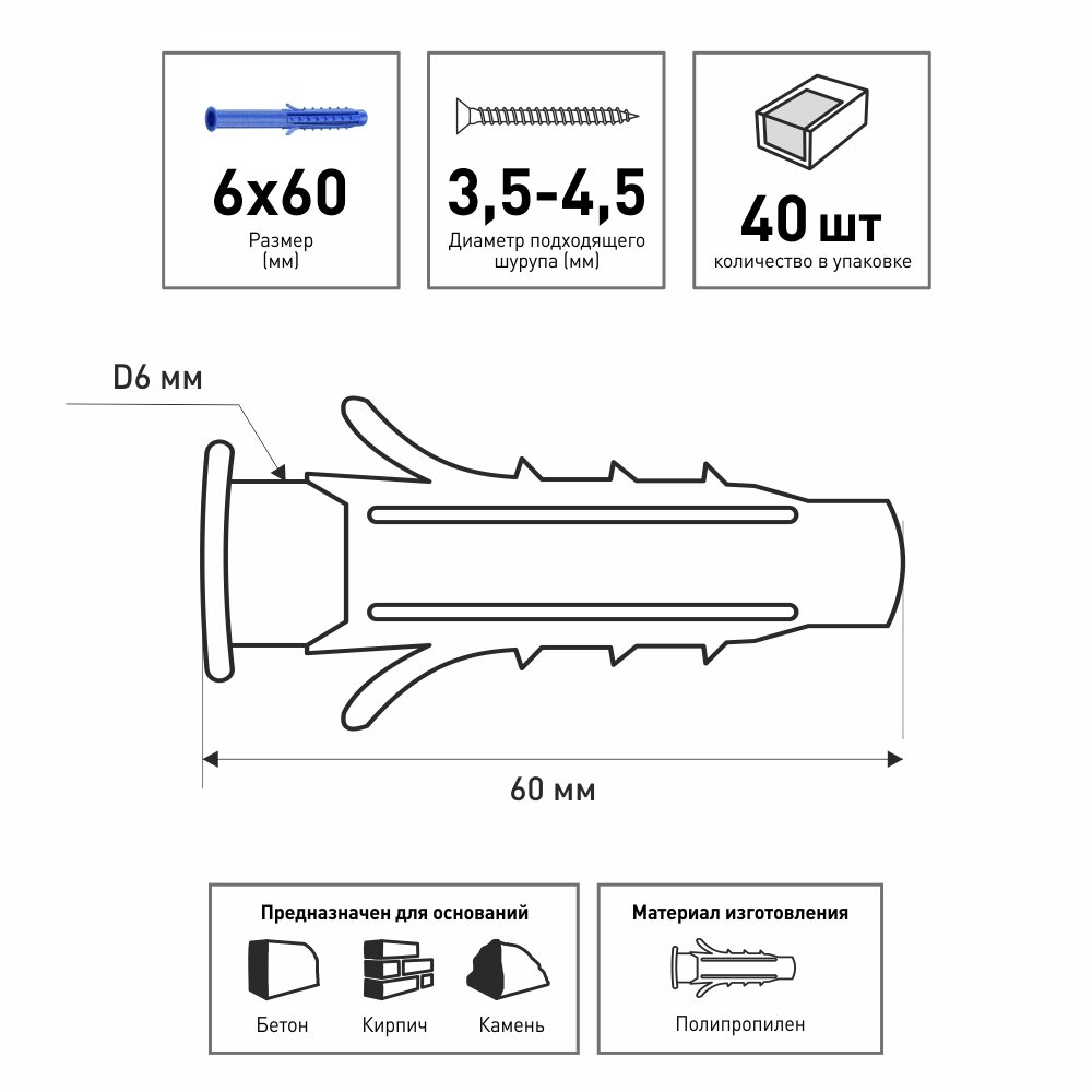 | Дополнительная информация | Дюбель для крепления изделий в полнотелых основаниях |