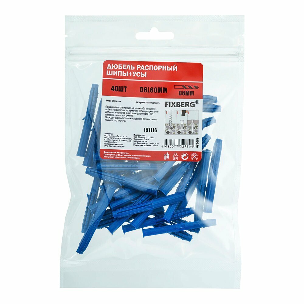 Дюбель распорный с шипами и усами FIXBERG 6х60 мм 40 шт интересное: