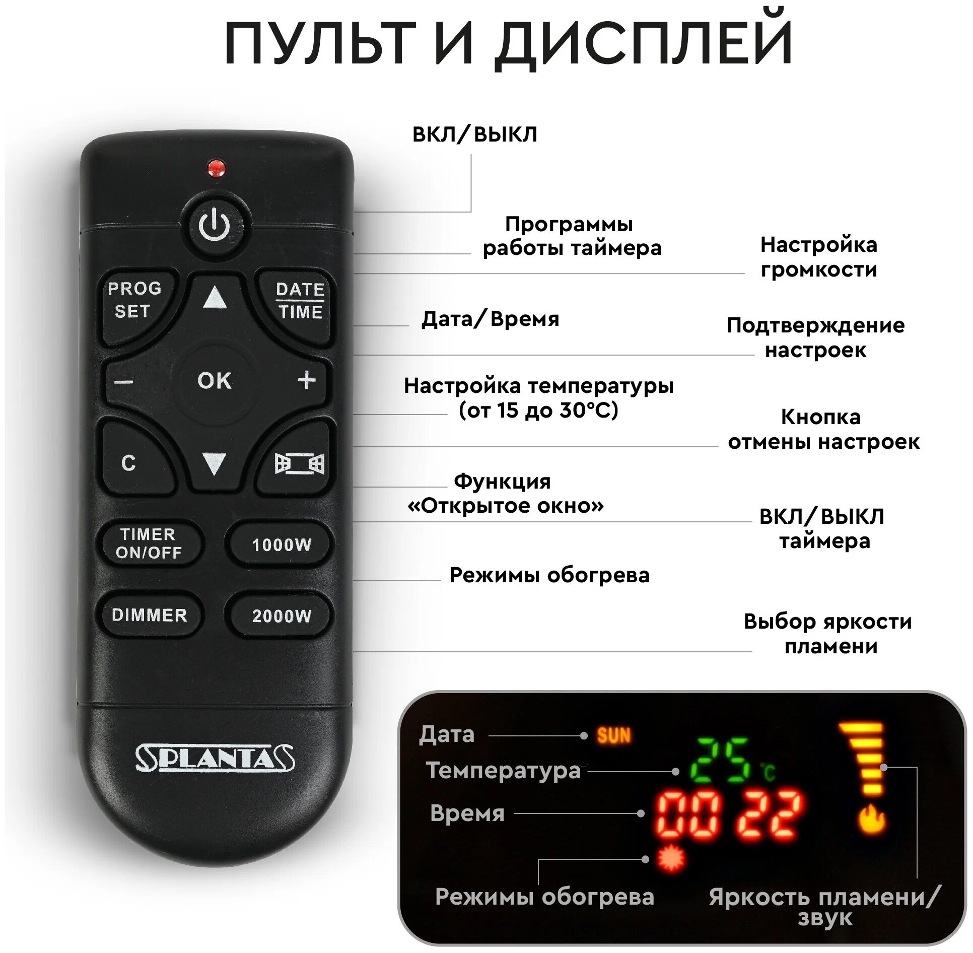 | Дополнительная информация | 2 вида декоративного топлива - белые камни и имитация дров, функция «Звук потрескивания дров», режим имитации пламени без обогрева |
