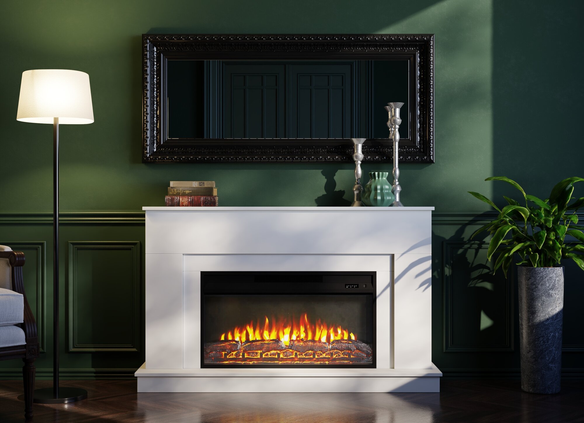 Купить Электрокамин Ostin с очагом Flash 36, обогрев, звук потрескивания дров, пульт ДУ, белый (камин электрический)
