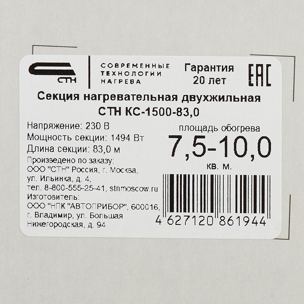 Теплый пол кабельный СТН Квадрат тепла КС-1500-83 7,5-10 кв.м 1500 Вт 83 м