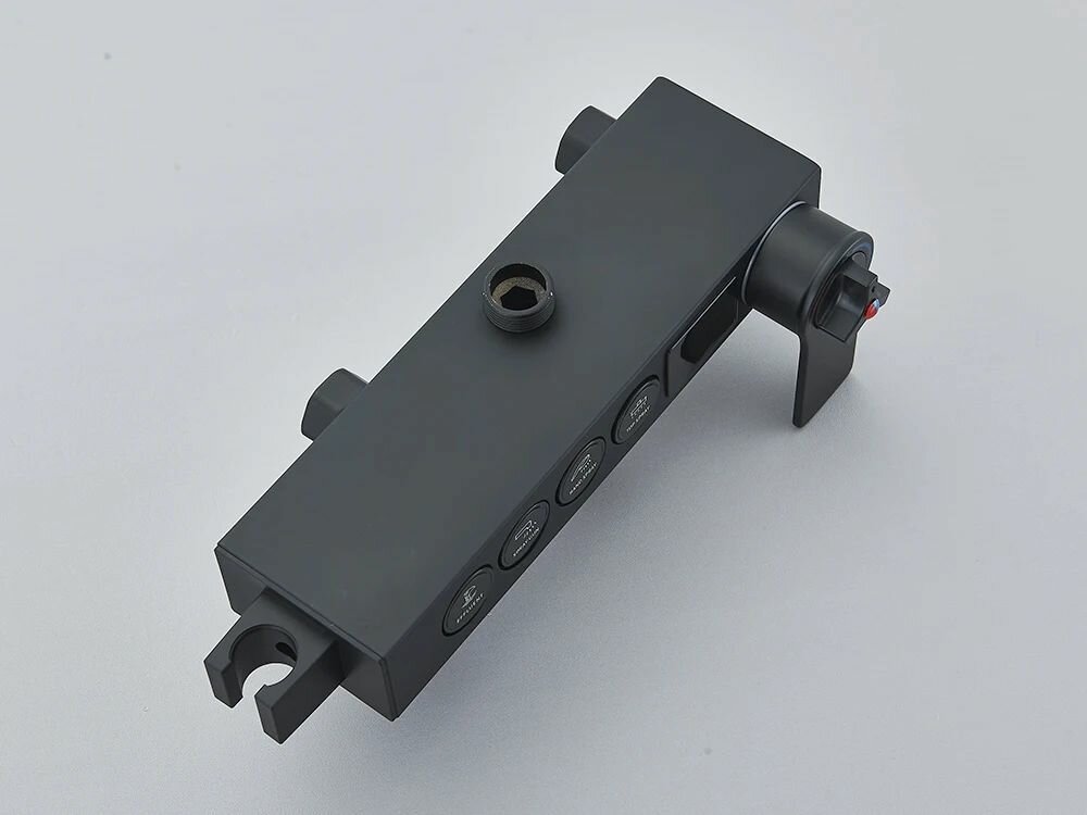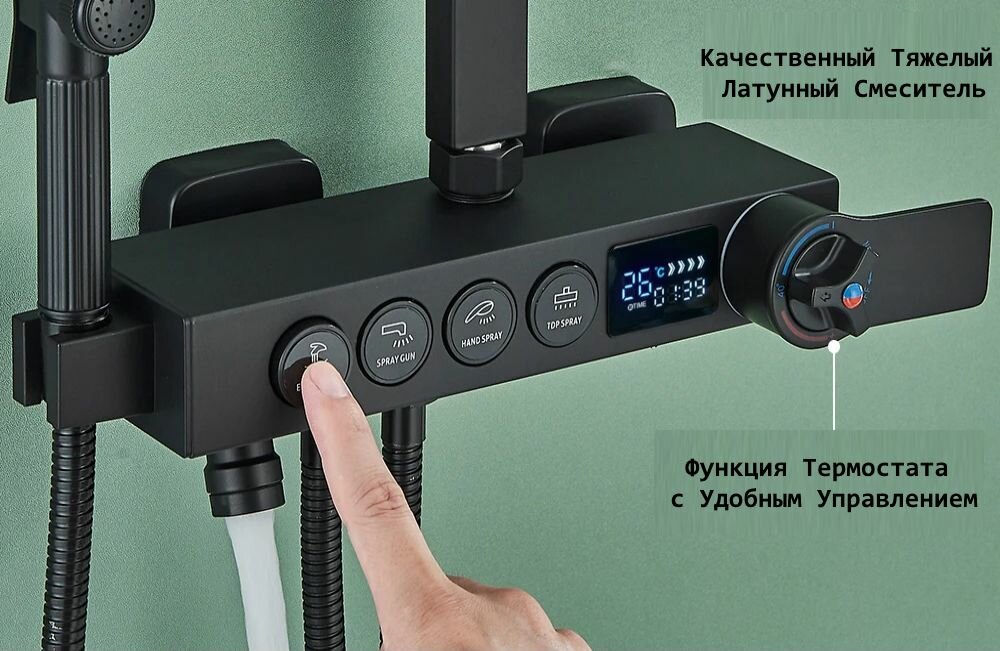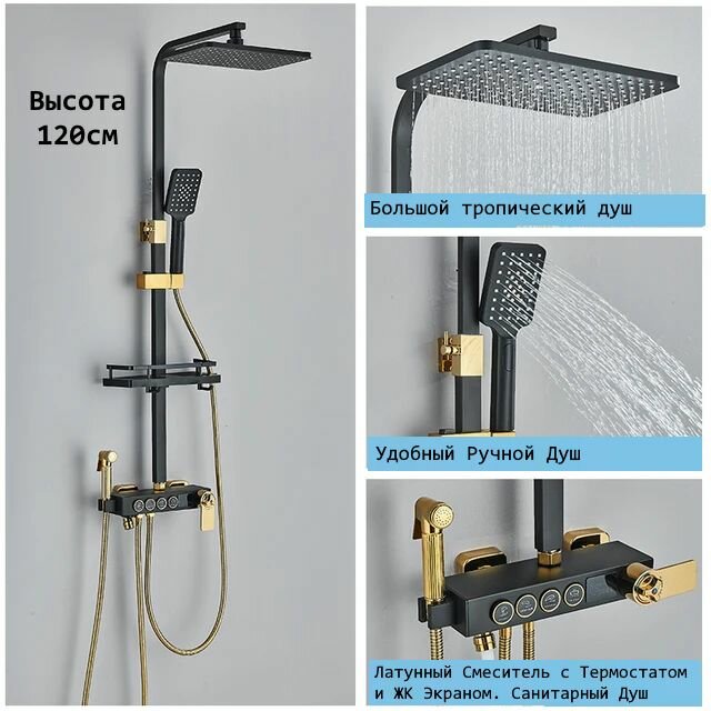 СохранитьДушевая стойка с тропическим, ручным и санитарным душем. Смеситель с термостатом и LED дисплеем. Душевой комплект гарнитур для ванны, душевой кабины. Цвет - черный мат/золото глянец. интересное: