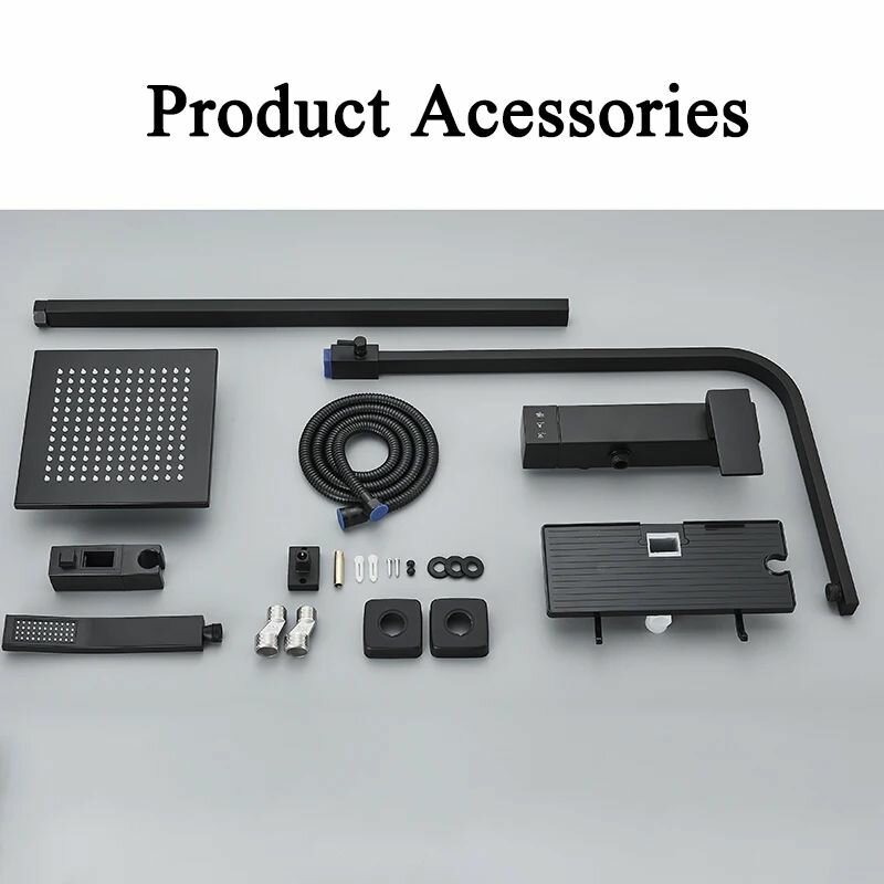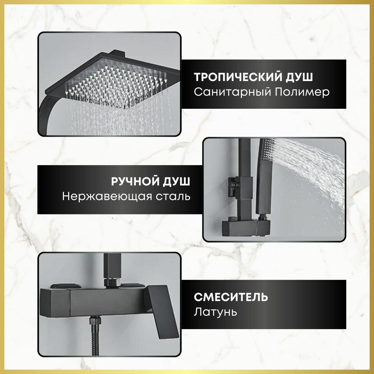 Душевая стойка с тропическим, ручным и санитарным душем. Смеситель с термостатом и LED дисплеем. Душевой комплект гарнитур для ванны, душевой кабины. Цвет - черный мат/золото глянец.