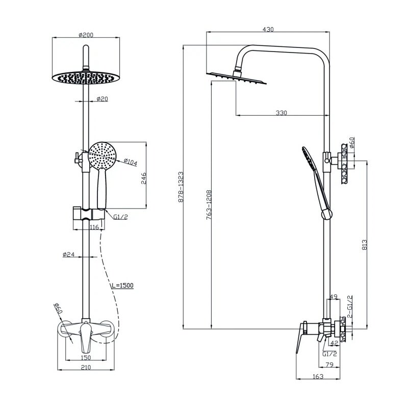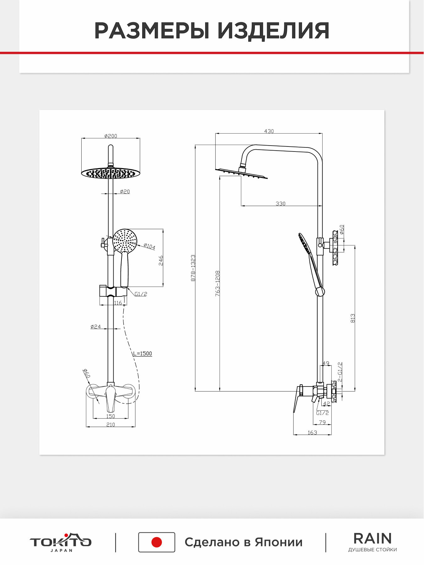 Душевая стойка с тропическим душем и смесителем TOKITO 153х21х47