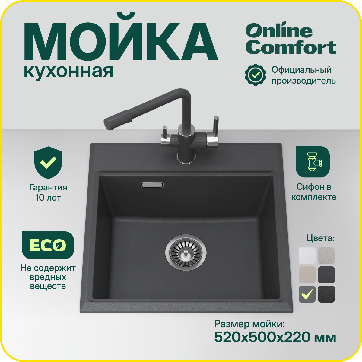 СохранитьВрезная кухонная мойка Comfort 52х50 см, кварцевая, квадратная, цвет Графит, модель 5202 интересное: