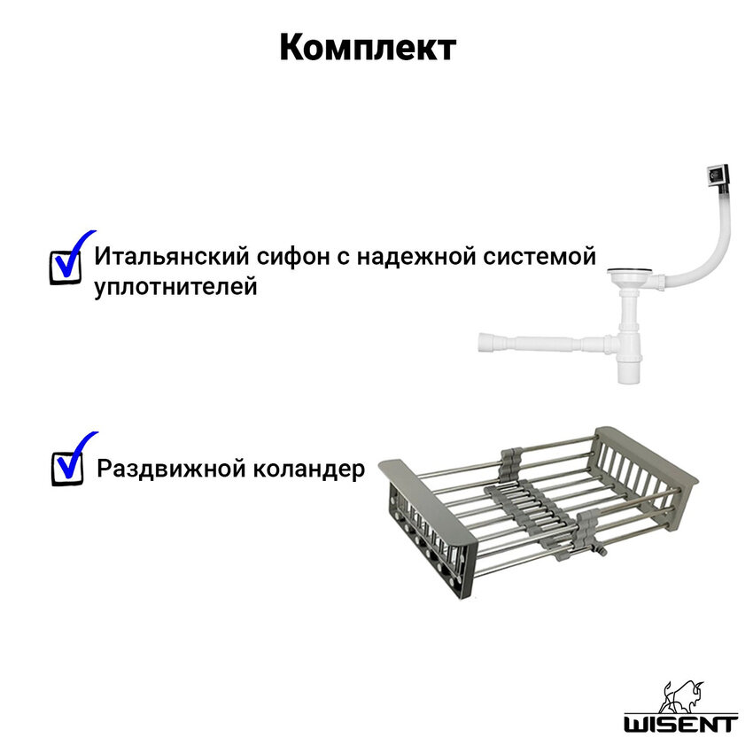Комплект мойка для кухни нержавеющая врезная 40*50 с коландером Wisent WWS34050/W302644/WGER010